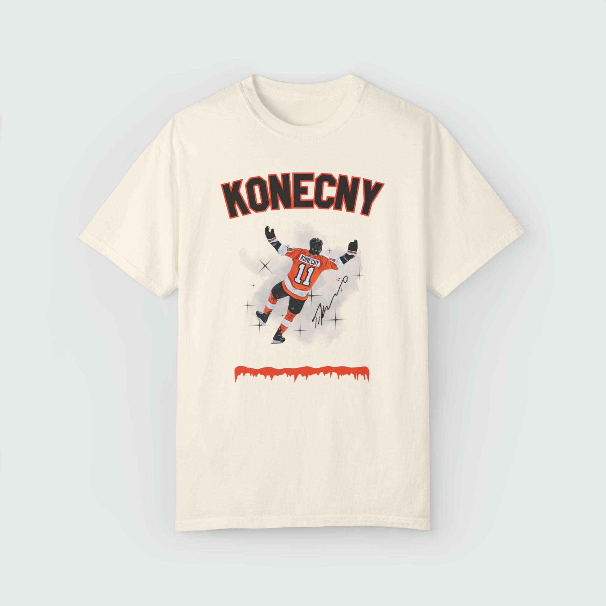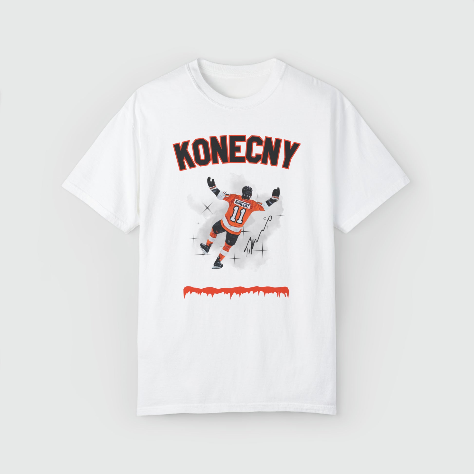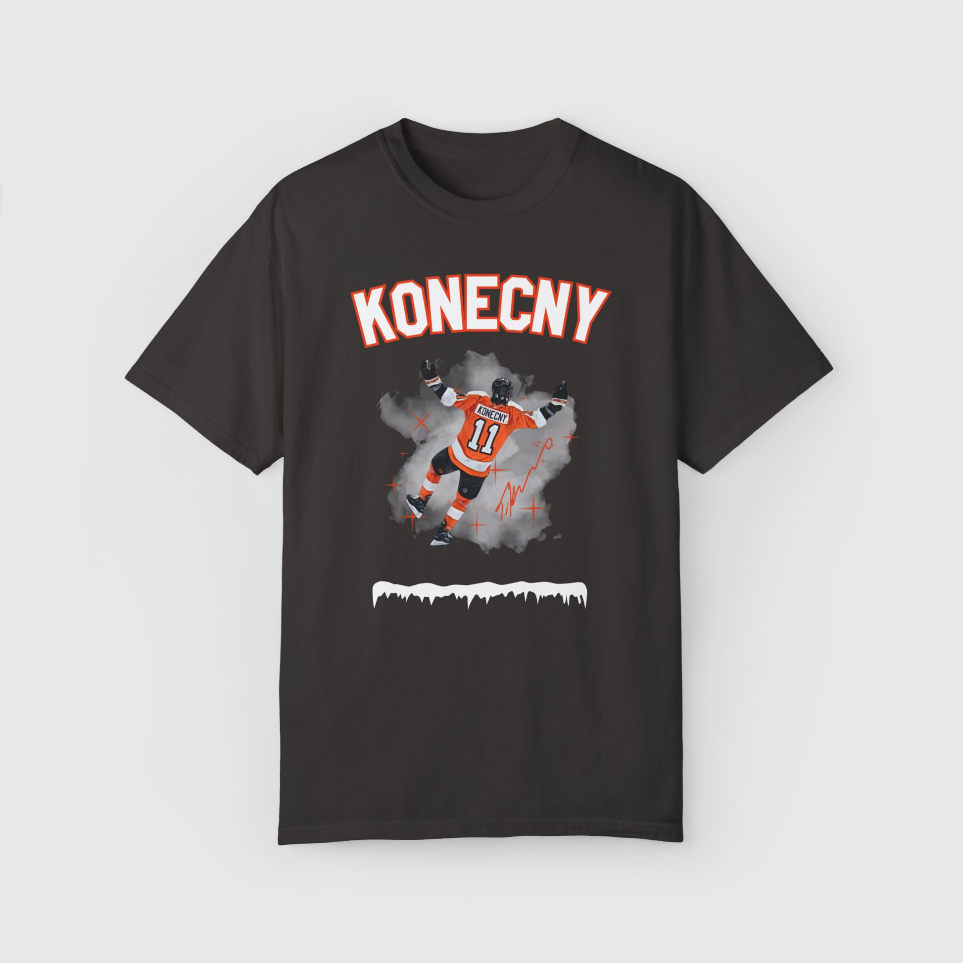 Who knew the Philadelphia Flyers would have so much juice this NHL season? Travis Konecny has been an offensive staple for this Flyers team as they continue to battle with their young talent. Celebrate the Flyers and Konecny with this custom designed Travis Konecny Ink Art Signature Tee - featuring an image of Konecny celebrating with an ink art design and his authentic style signature.
